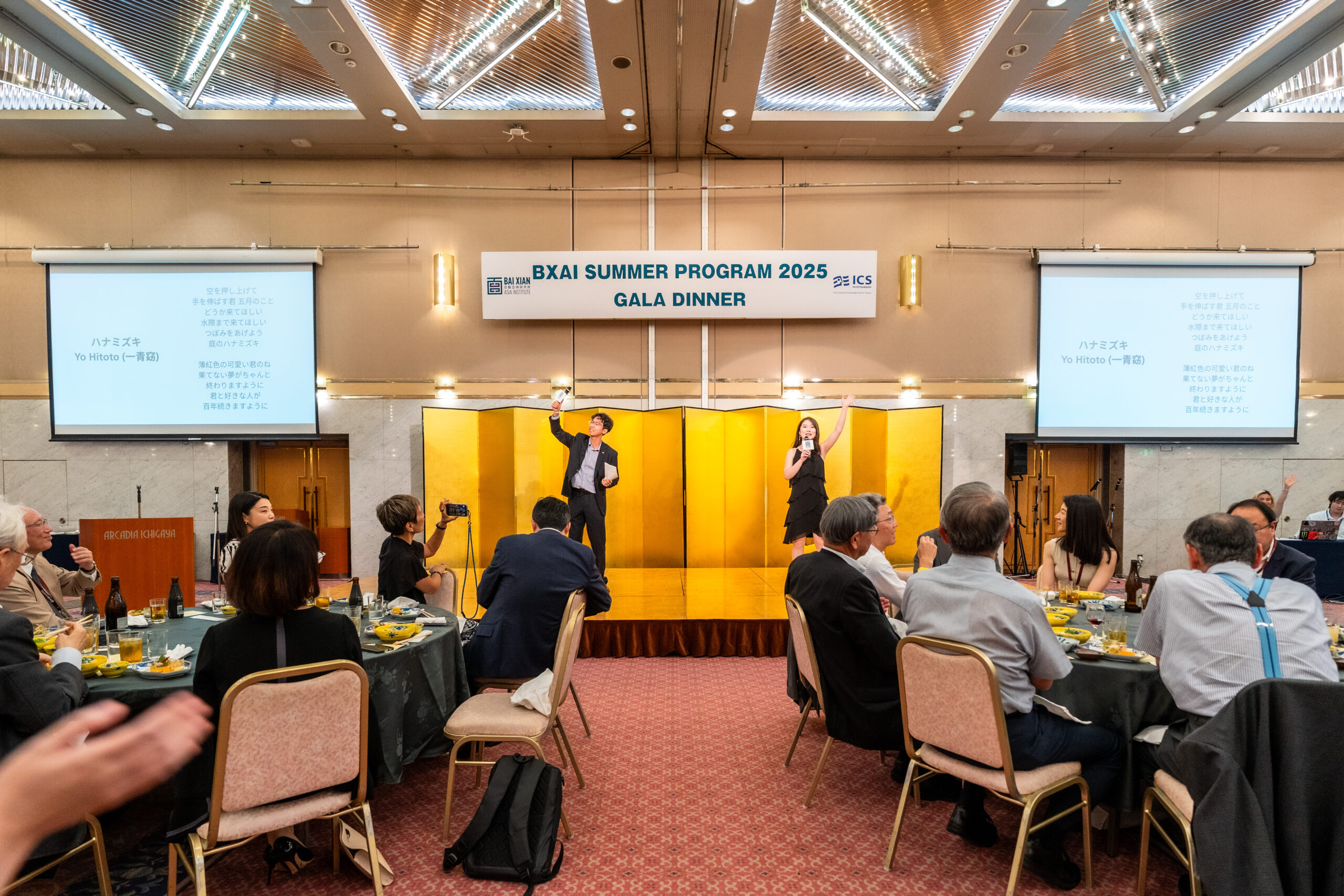 The final day of the Summer Program featured BXAI’s signature events, including the Conducting Leadership Workshop, a closing ceremony, and a gala dinner. Returning speaker, Mr. Jason Lai, led the leadership workshop, using the art of conducting an orchestra as a powerful metaphor for facilitating teamwork in practice. Experiencing the collaborative dynamics of a live orchestra, scholars considered the identity of a leader and gained insights into how leaders can harmonize diverse talents and harness collective strengths. The 2025 closing ceremony took place in the afternoon, which featured remarks from Hitotsubashi ICS’s Prof. Emi Osono and BXAI’s Ms. Laura Cozijnsen, a core member of our Communication and Development Committee. The keynote speech was delivered by Mr. Chang Sun, founder of Blacksoil Group and Senior Advisor at TPG Global. Mr. Sun shared with us his personal journey about seizing opportunities and making the “right” choices that might have significant impact on one’s life and career.